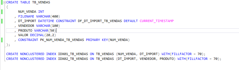 A tabela contém 7 colunas, contendo duas constraints do tipo PRIMARY KEY na coluna NUM_VENDA que além de garantir a unicidade da informação, vai me ajudar em performance no momento de atualização da base quando relacionado o campo NUM_VENDA no merge ou por consultas especificas. E um campo DEFAULT em DT_IMPORT, com o objetivo de capturar o momento exato em que ocorreu a importação de forma automática após o insert.