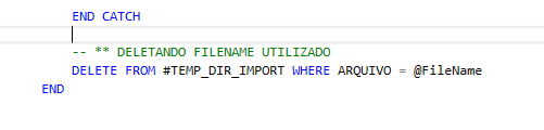 Etapa final do processo, onde realizo o delete na tabela #TEMP_DIR_IMPORT filtrando pelo @FileName utilizado, garantindo assim que o looping tenha fim ao percorrer todos os arquivos disponiveis.
