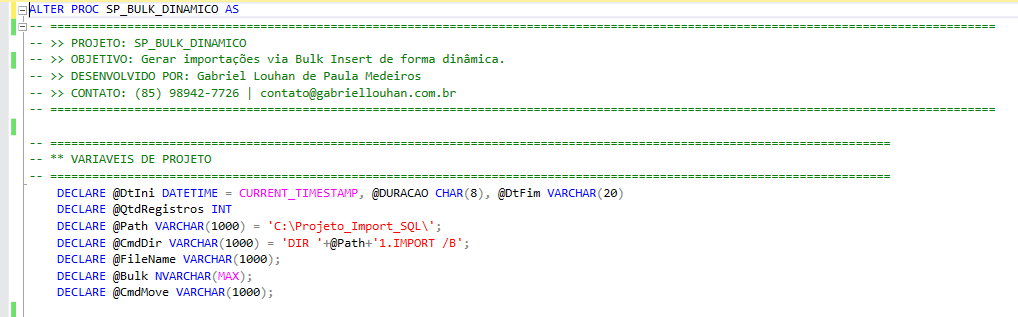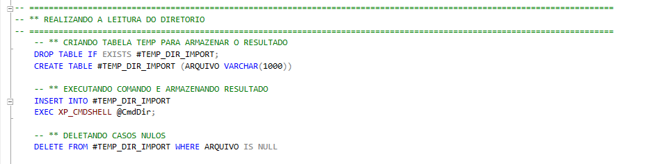 - @CmdDir: Variável responsável por armazenar o comando de leitura (dir) no diretorio de importação, e posteriormente executada via xp_cmdshell.
