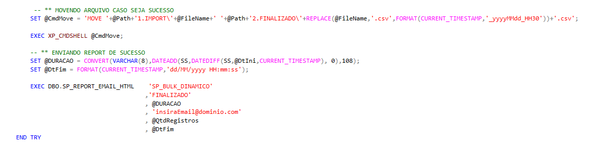Nessa etapa é reservada para tratativa de eventuais erros na execução do processo, por meio do BEGIN CATCH.