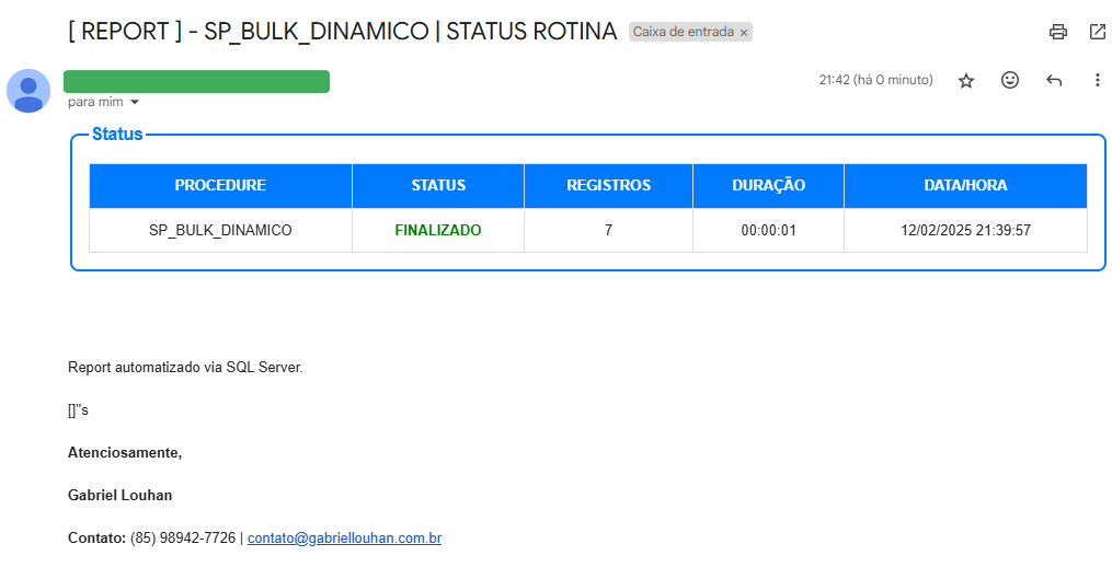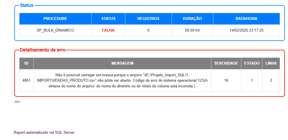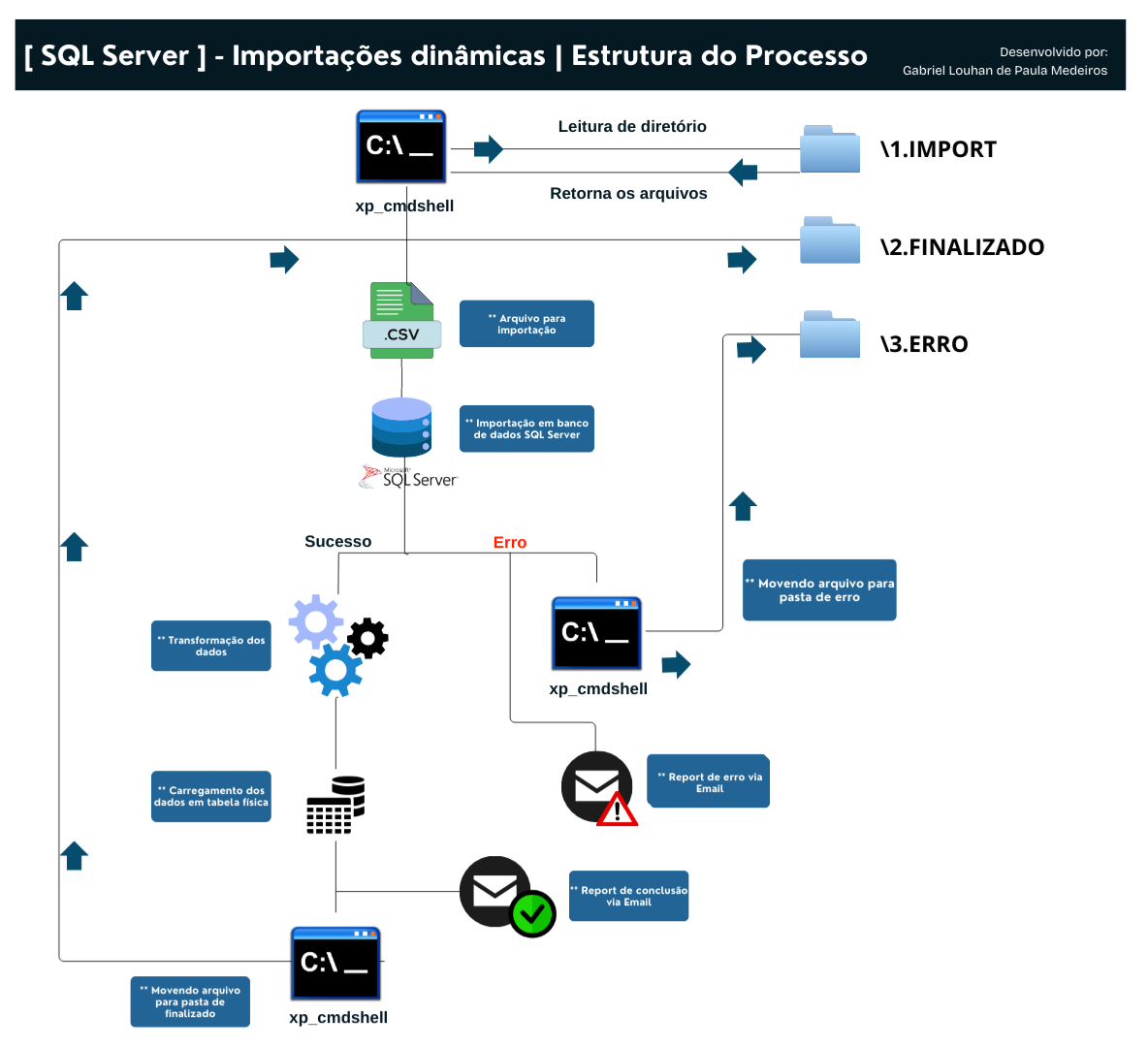 Processo automatizado desenvolvido para gerenciar a importação de arquivos via SQL Server. Ele lê um diretório específico, processa os arquivos de forma dinâmica e os insere no banco de dados, garantindo agilidade e confiabilidade.