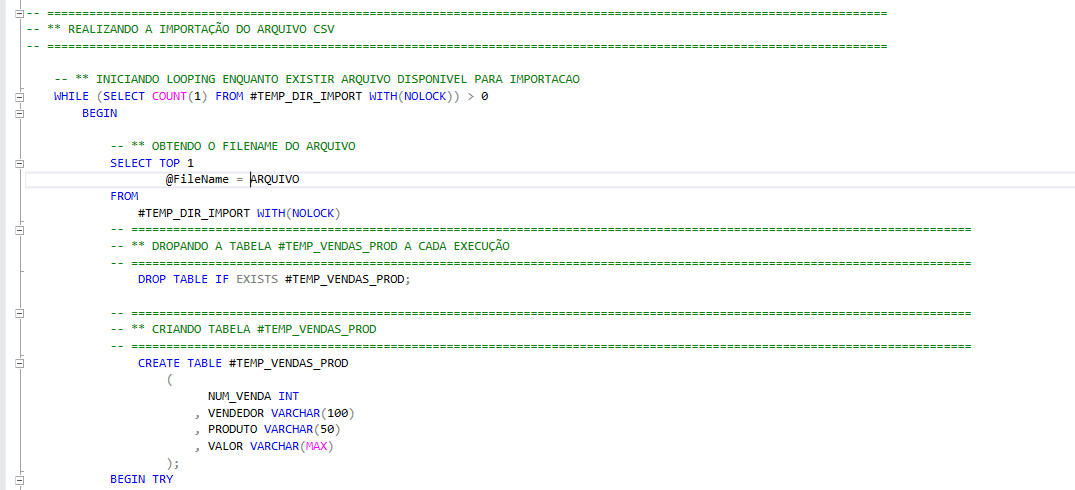 Ainda dentro do looping while, é aberto um bloco para tratativa de erros "BEGIN TRY".